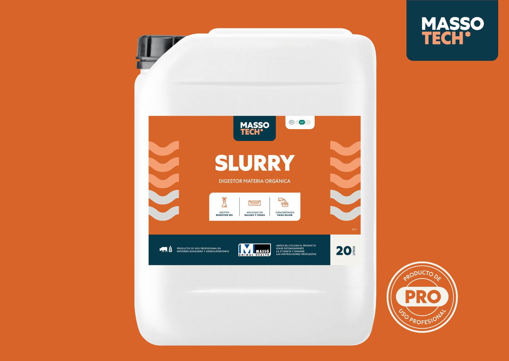 MASSOTECH SLURRY es un concentrado líquido para licuar purines en explotaciones ganaderas intensivas.